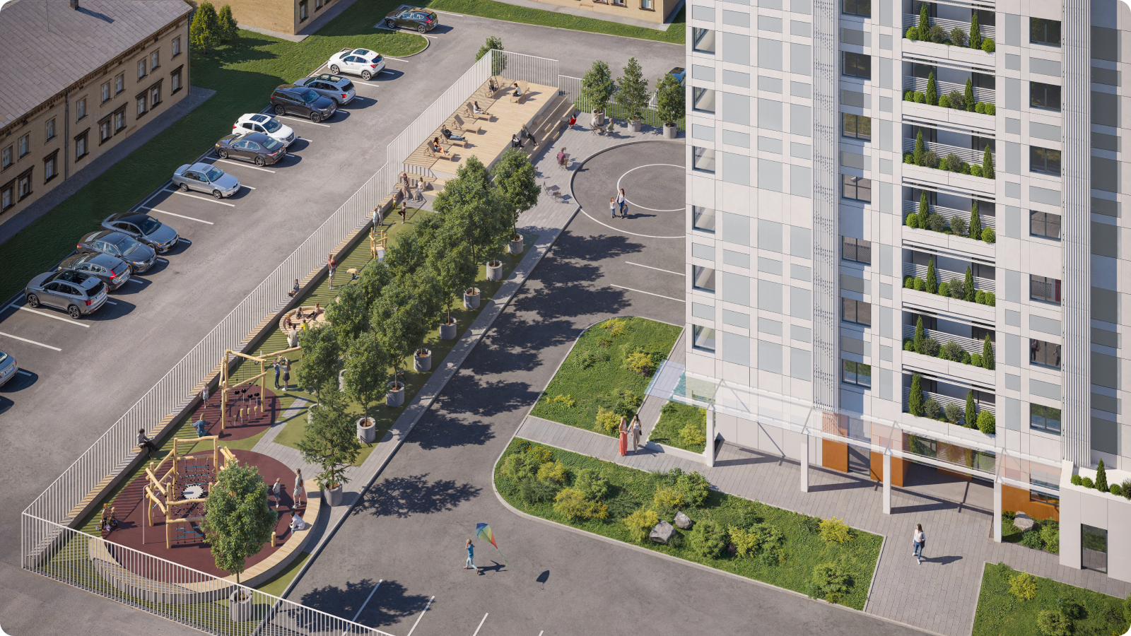 3 Огражденный стилобат: сквер со столиками в тени, площадки для малышей, вело-колясочная парковка, пляж с шезлонгами — весь двор солнечный, вокруг дома 2 этажа. Ограничен въезд авто для безопасности малышей.