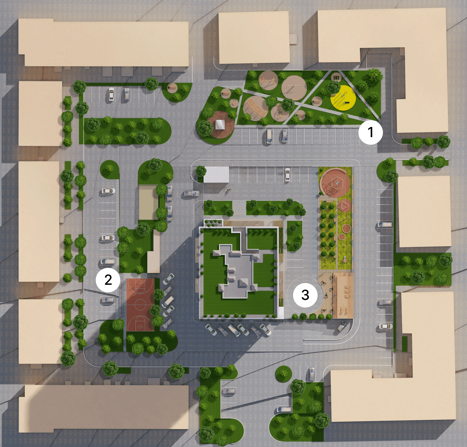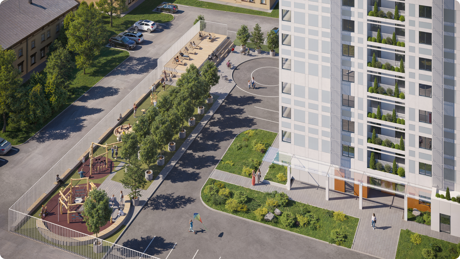 3 Огражденный стилобат: сквер со столиками в тени, площадки для малышей, вело-колясочная парковка, пляж с шезлонгами — весь двор солнечный, вокруг дома 2 этажа. Ограничен въезд авто для безопасности малышей.