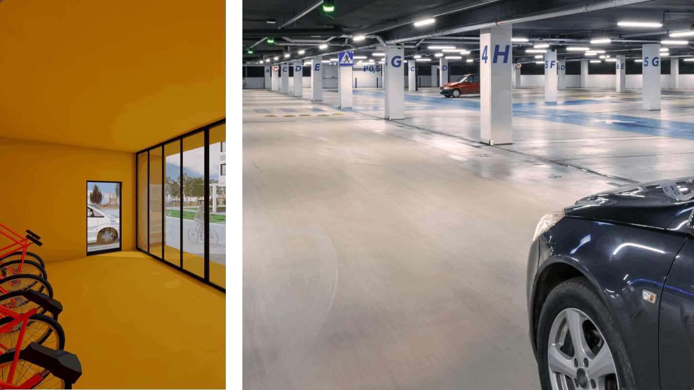 Отдельно-стоящая вело-самокато-колясочная парковка напротив парадной. Вход с ключом жильца, видеонаблюдение. Это акцентный объект архитектуры вашего двора.
