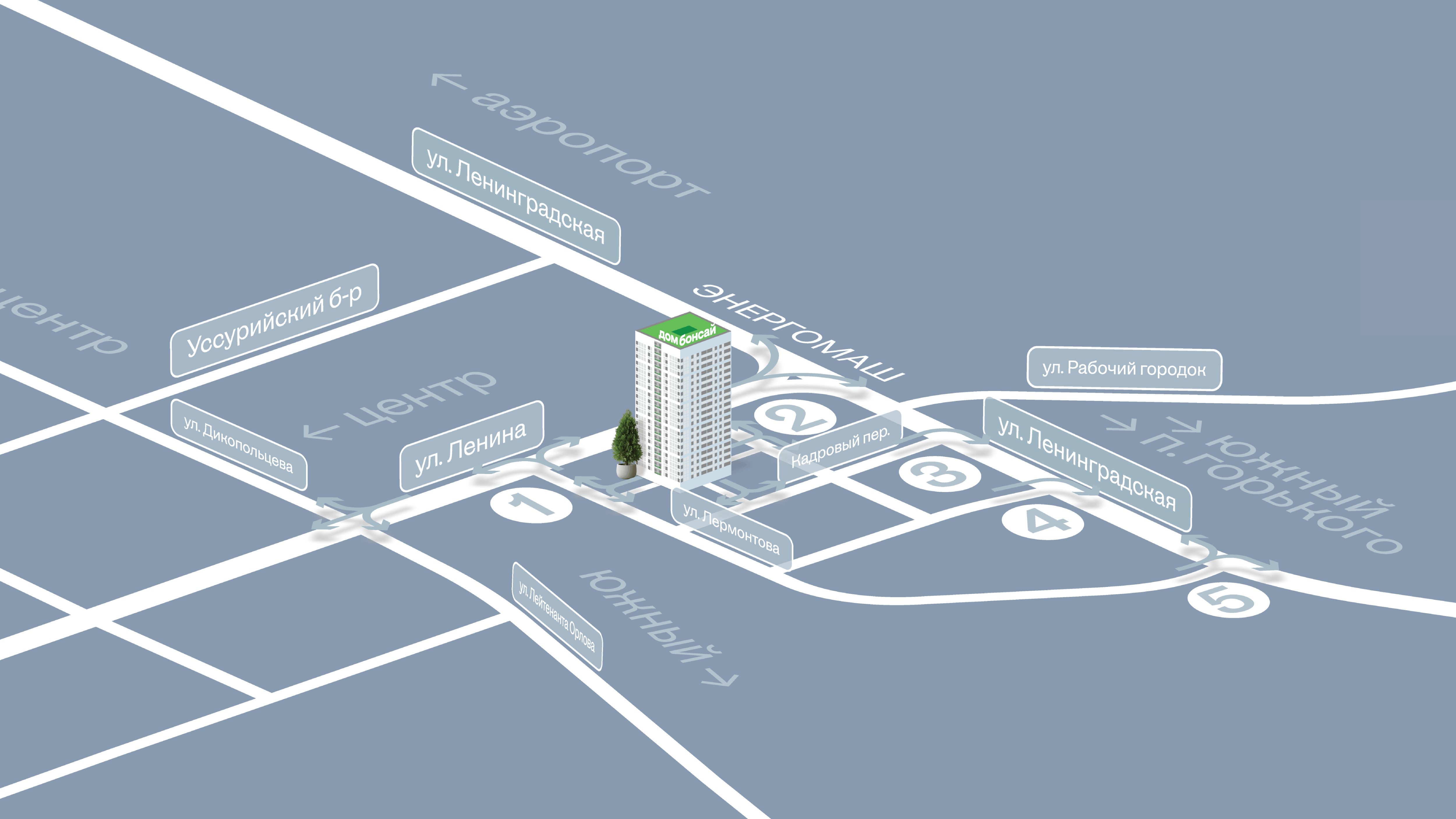 С прилегающей территории 5 выездов сразу на главные дороги, во все стороны города. Вы в Центре, но можете стартовать в Южный, Северный, Аэропорт без долгих объездов. То же и с автобусными остановками.